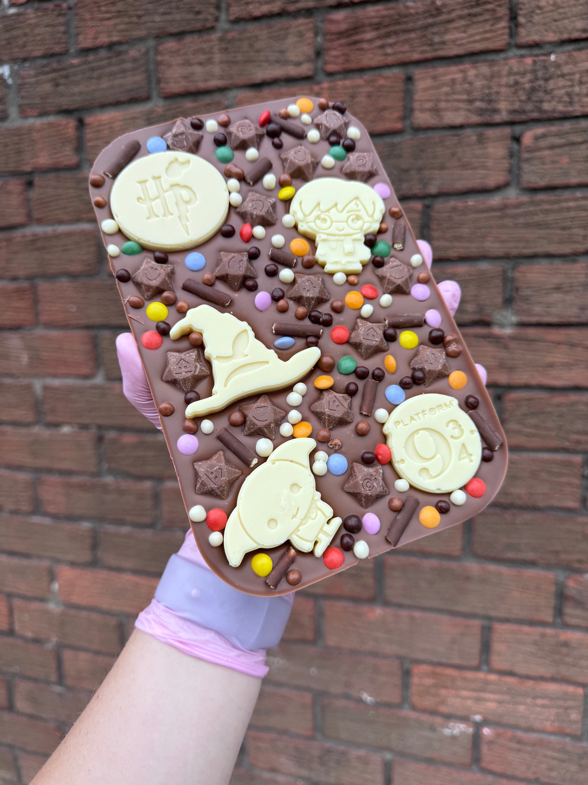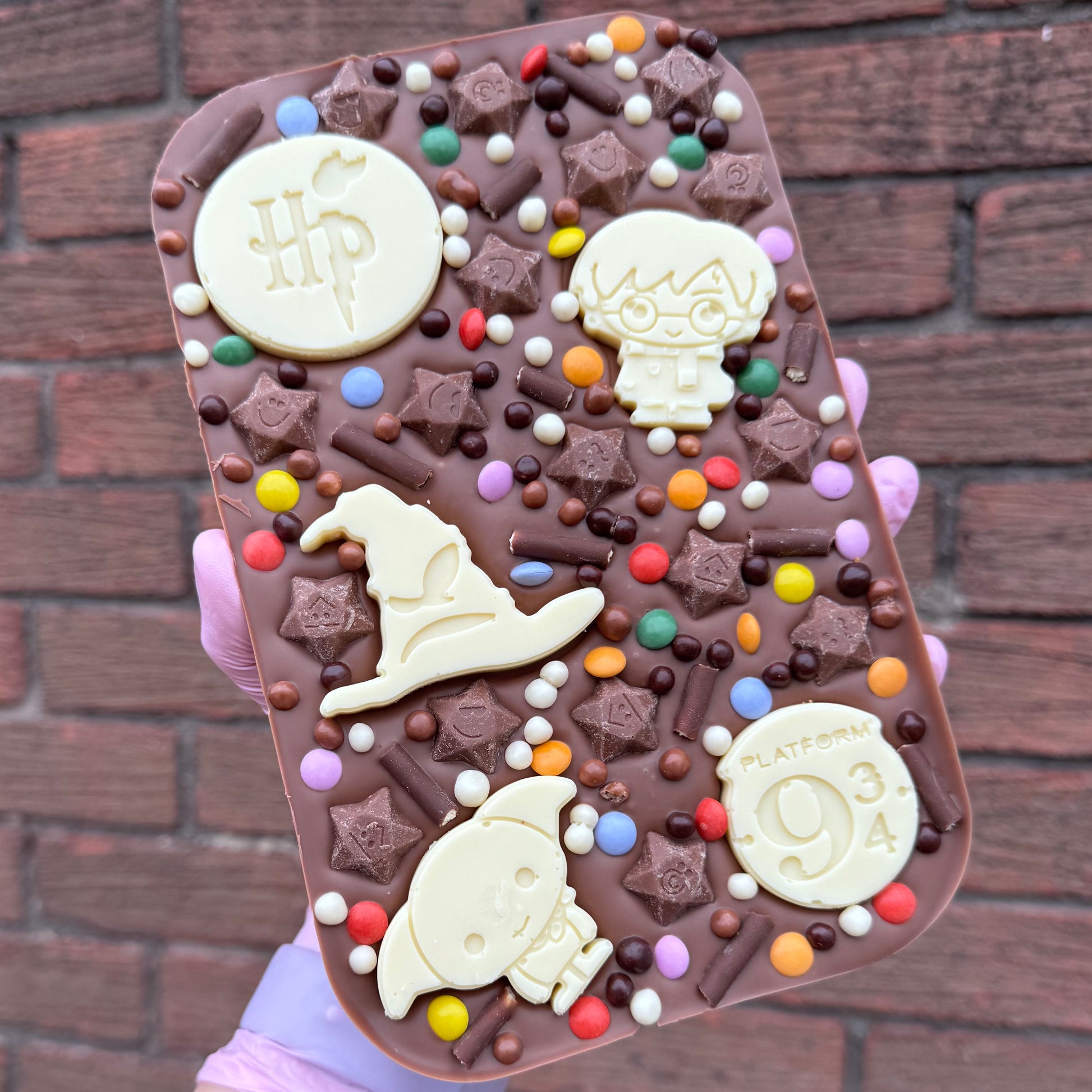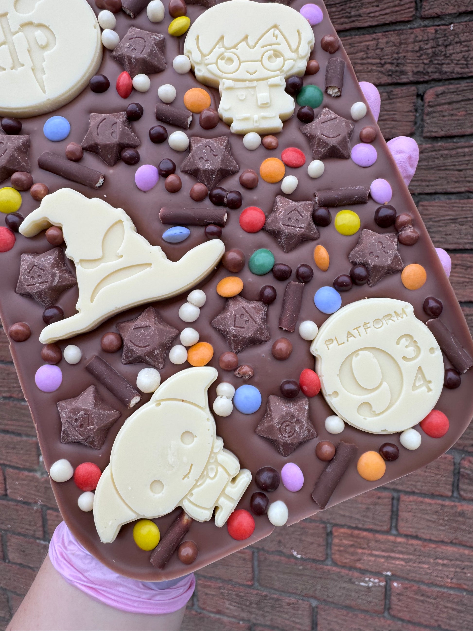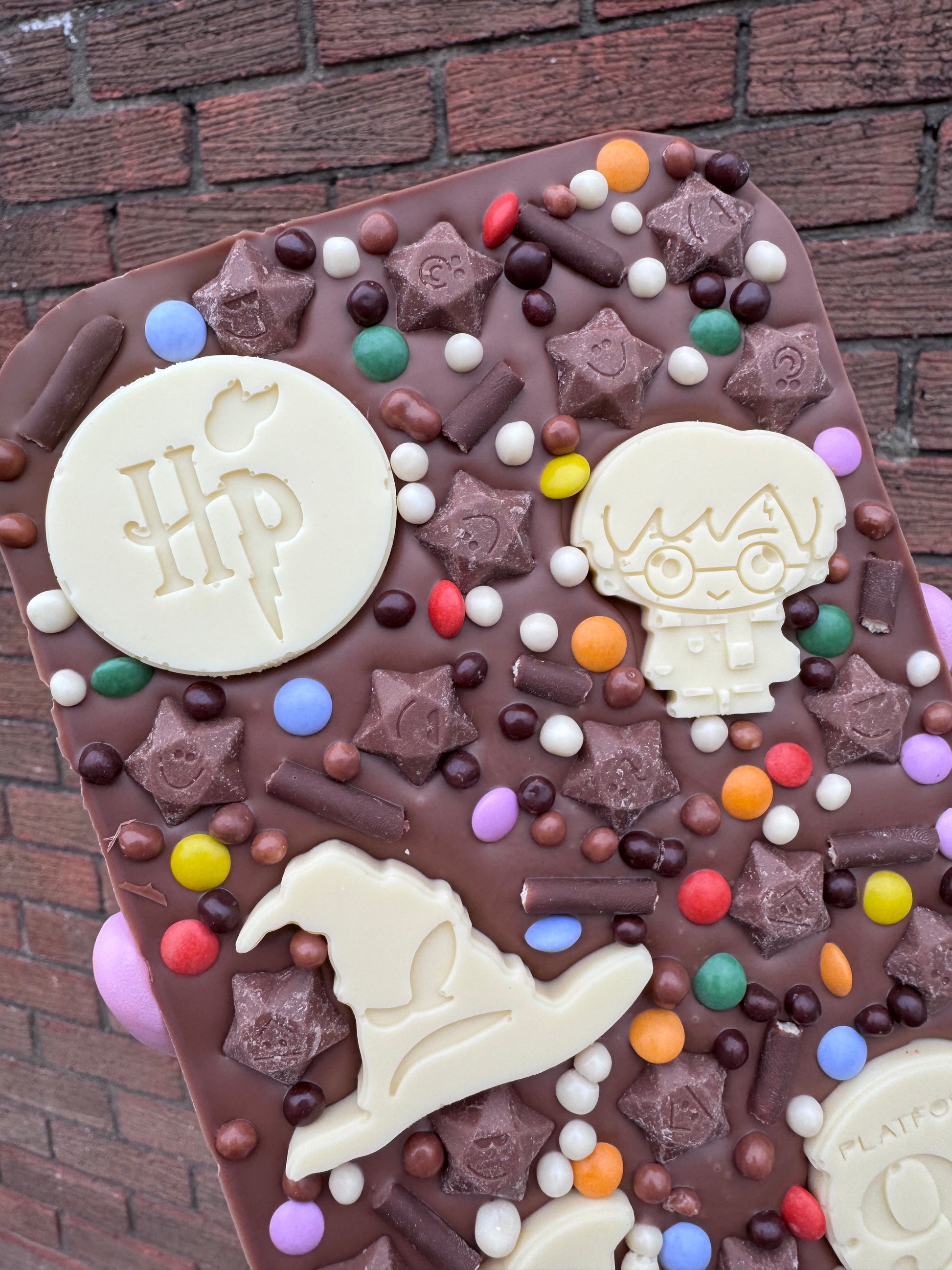 Harry potter lovers, this one’s for you. Hand made with our delicious callebaut milk chocolate. Topped with the white chocolate Harry Potter chocolate, magic stars and mini smarties.