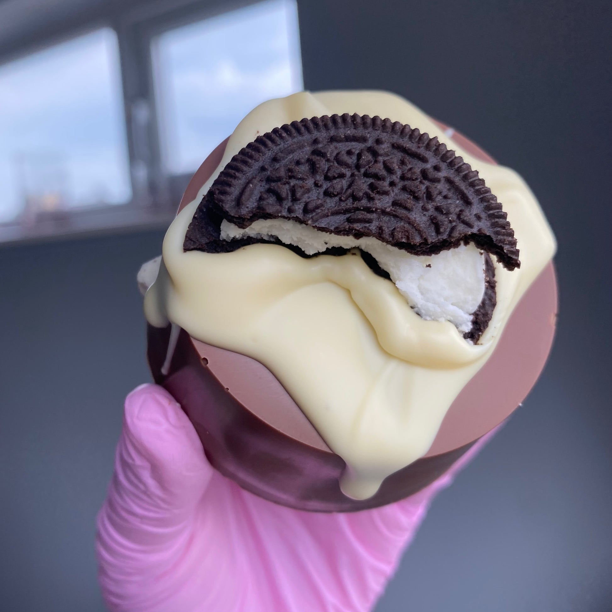 Cookies and cream milk chocolate cup, filled with cookies and cream spread, with a double stuffed Oreo placed in the centre filled back over with Belgian milk chocolate. White Belgian chocolate drizzled over the top with half an Oreo.