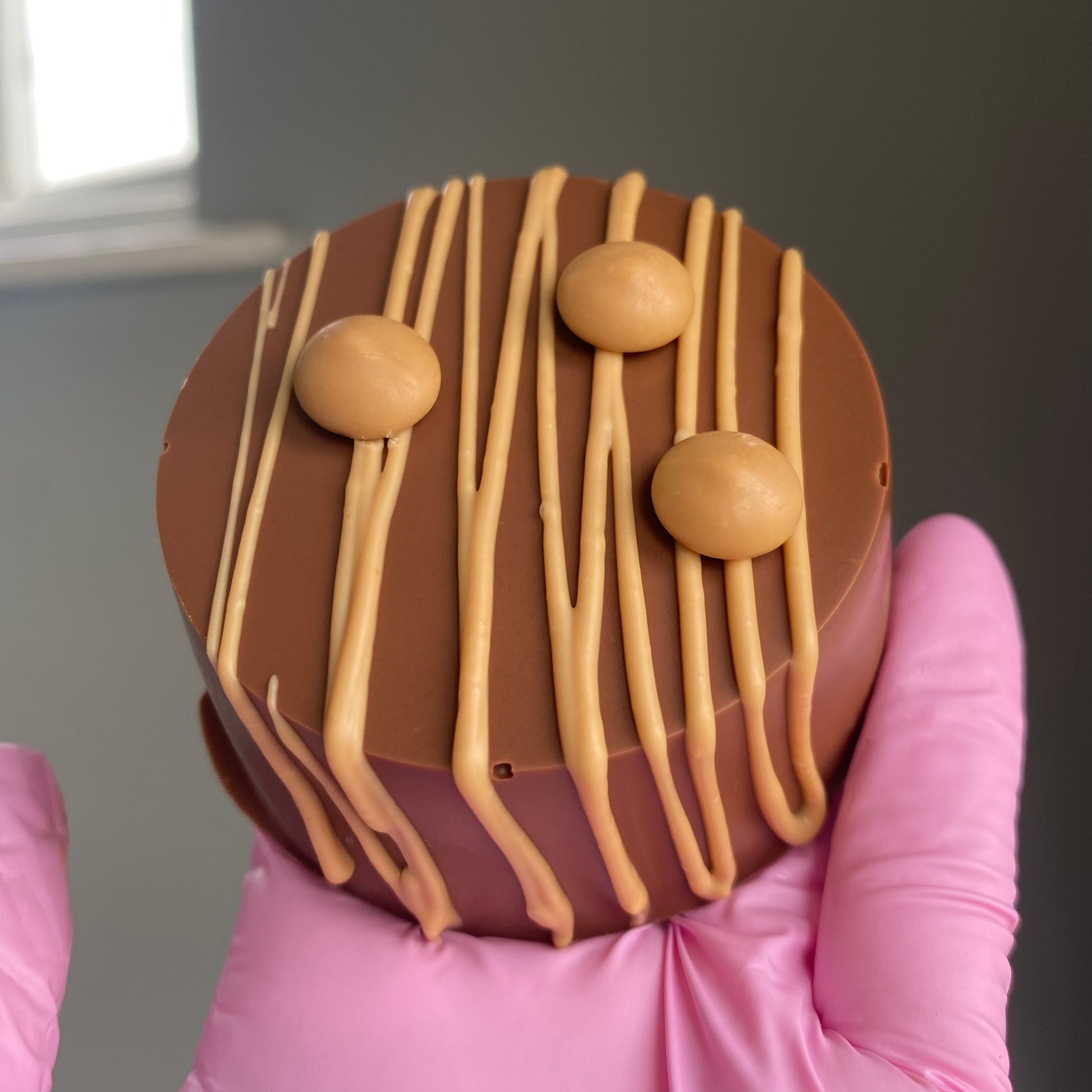 Belgian milk chocolate cup, filled with crunchy caramel cornflake sauce, filled back over with Belgian milk chocolate & caramel chocolate drizzled over.