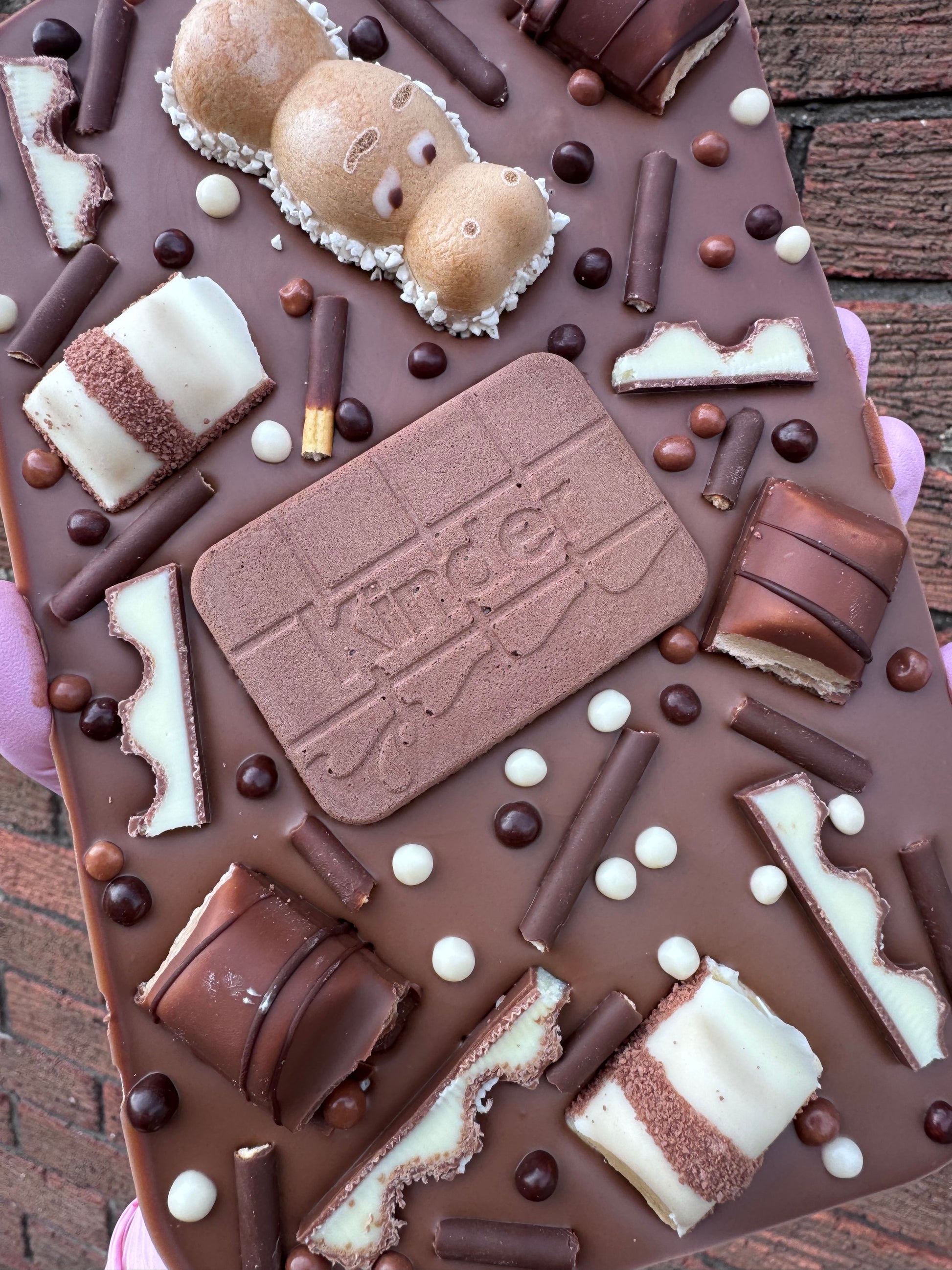 Our kinder loaded slab is a Belgian chocolate based topped with all the delicious kinder chocolates, kinder hippos, kinder buenos ( milk & white ) & kinder maxi bars.